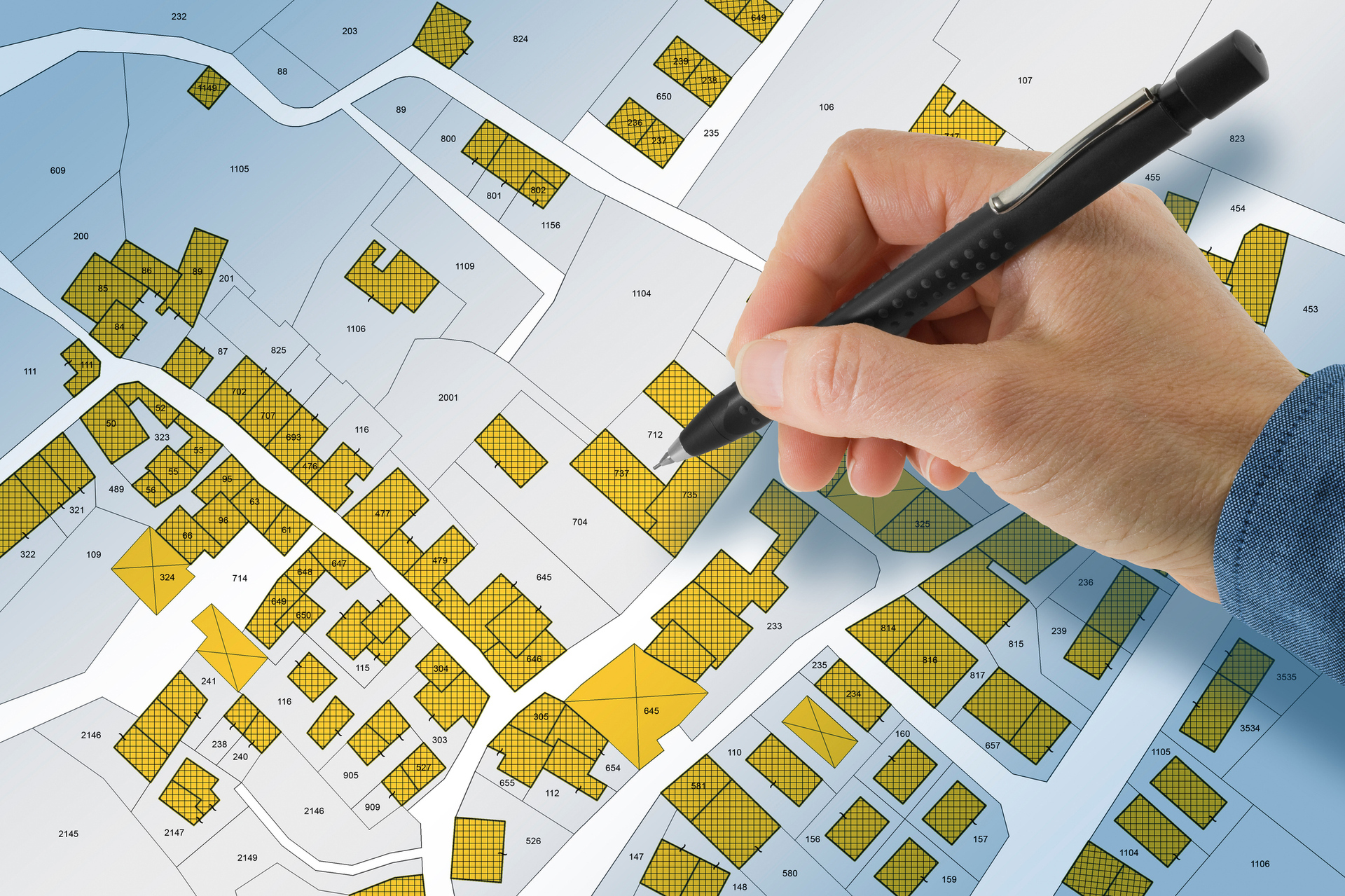 Imaginary cadastral map with buildings, land parcel and vacant plot - Land records and property registry concept with cadastre documentation and ownership parcel identification